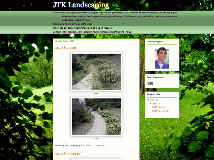 Of course the “JTK Landscaping” guys are indeed handing our flyers, and getting plenty of old fashioned word-of-mouth. But beyond co-opting parental blogs, they have their own very fine website with a helpful rotating photo gallery of the crew and past jobs. I admire these trust-inspiring initiatives. And I admire Jeremy’s chutzpah in asking about my blog.