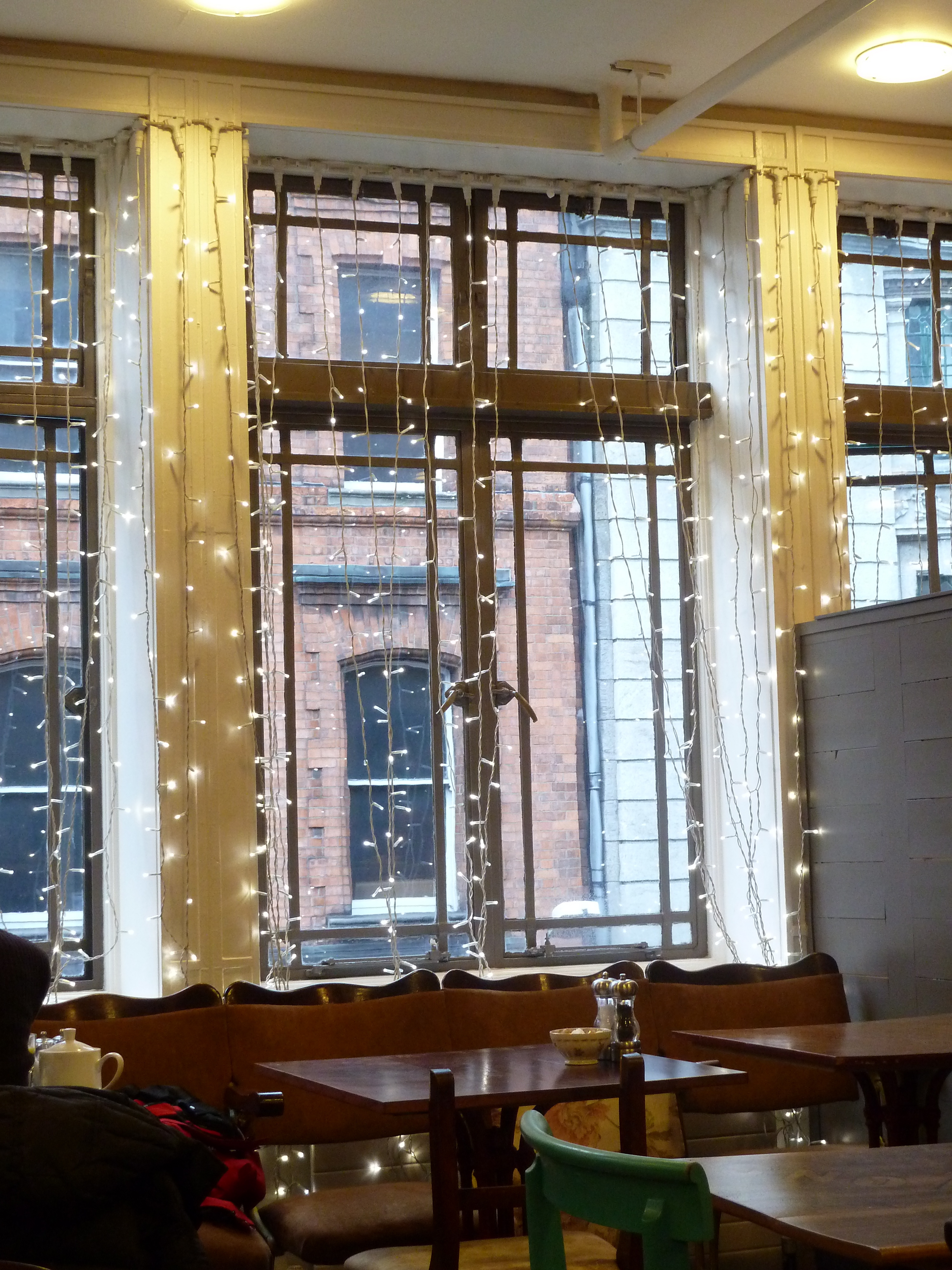 And I solved a personal decorating dilemma at the Avoca cafe–how to cover some huge windows in a family room that have been annoyingly bare since they were added in 1998.  (I can be crazy patient about doing “without”—until I see what I want.  Then I go on a tear.) This simple use of fairy lights is going right into my home, possibly covered with some thin filmy voile to create a bit of mystery.