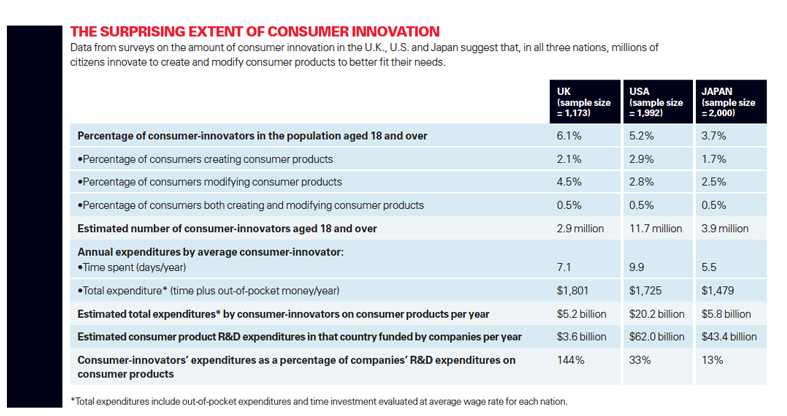 An American MIT professor, a Japanese Kobe professor and a Dutch Erasmus professor studied the “consumer innovator” R & D investments in the US, Japan, and the UK.  The findings are impressive for the US and the UK: