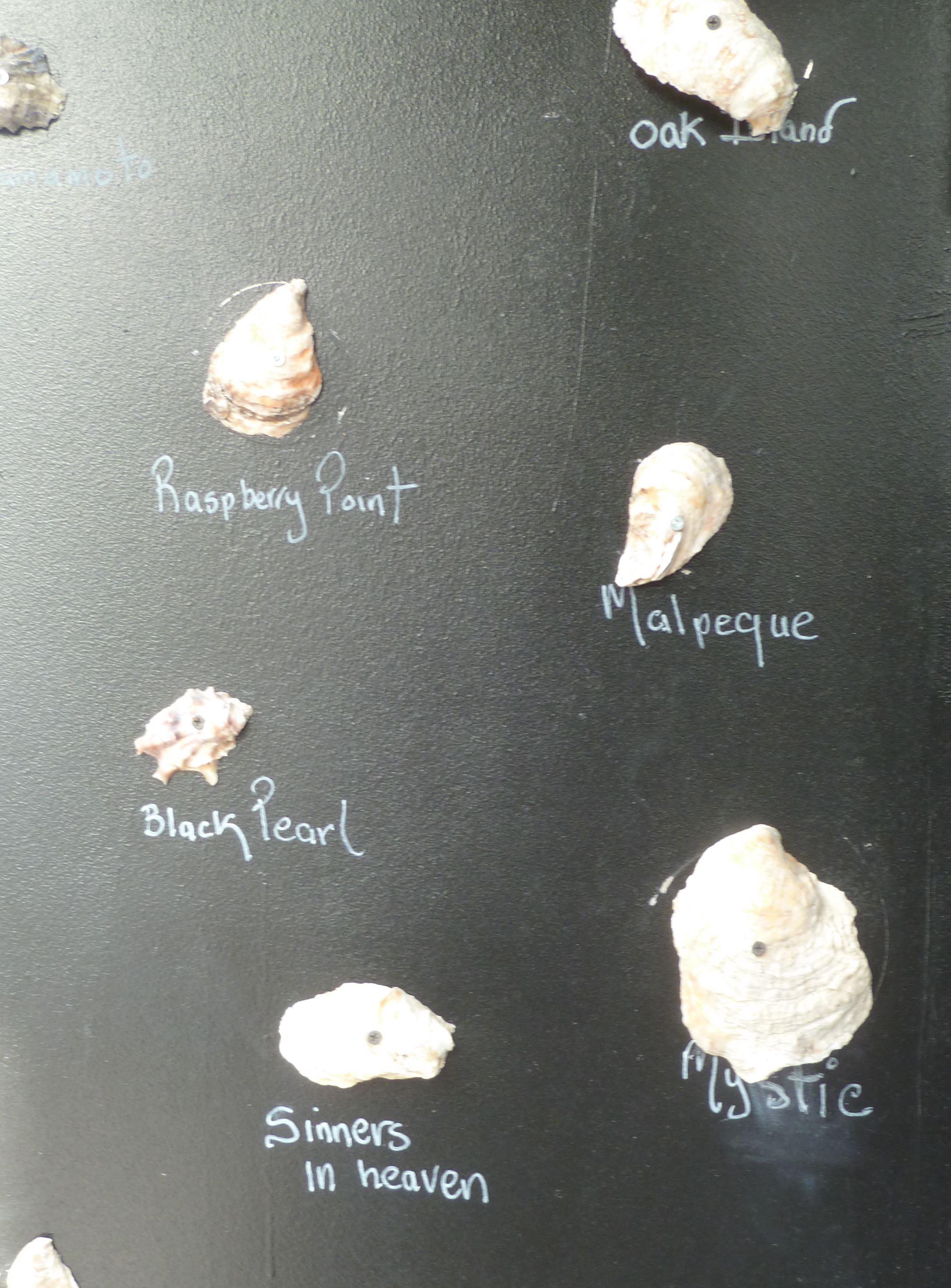 A clever way to communicate the range of oysters at a restaurant. This was on a tall wall right next to the sidewalk, facing oncoming pedestrians.