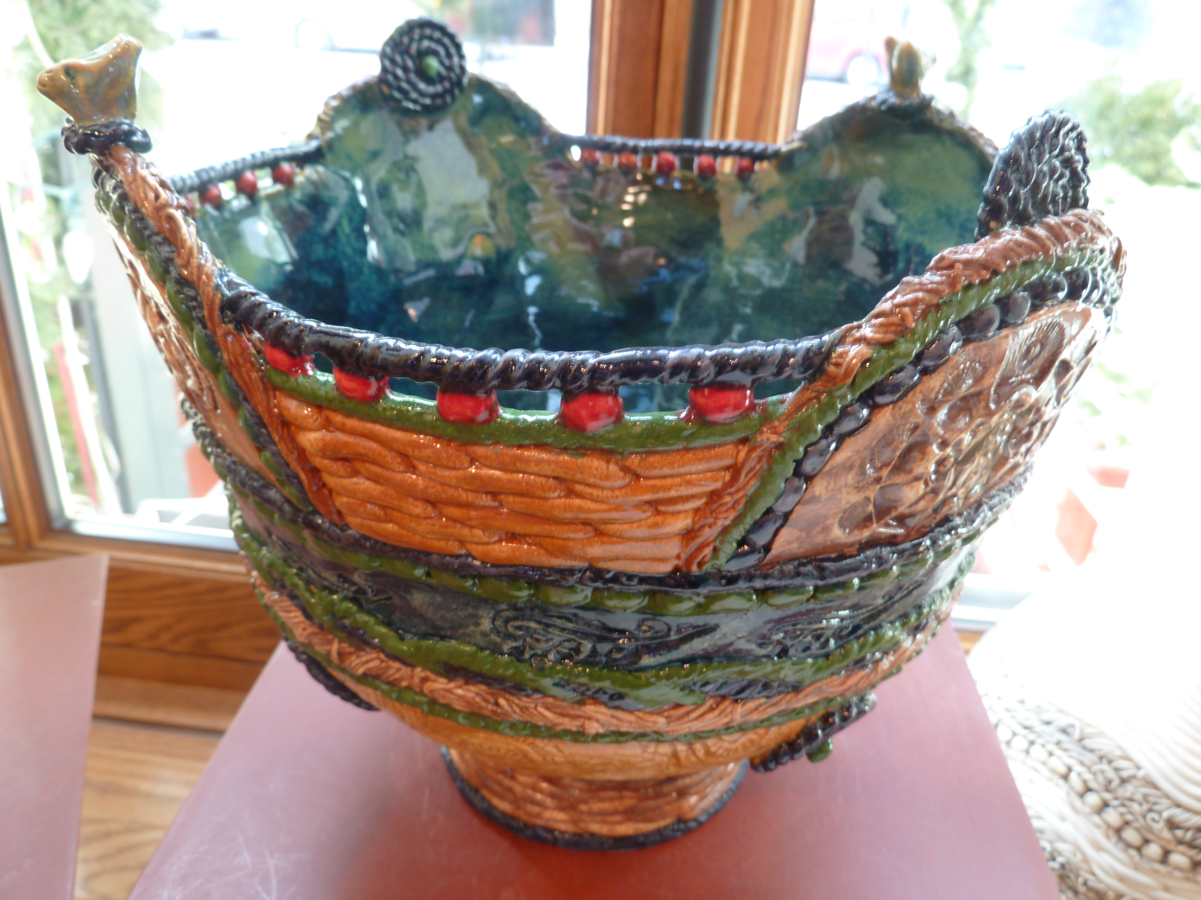 I appreciated the intricate clay work on this piece by Quebec artist Marie-Ange Samon . I bought one, but the photo of mine is too blurry to do it justice.