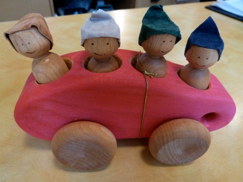 I bought this for my nephew's upcoming 2nd birthday, made in Quebec. The adorable little guys have leather hats, and the wood is silky smooth.
