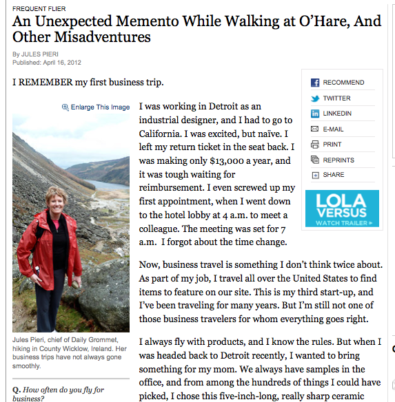 Today’s press is a travel mishaps piece by Joan Raymond in the Business section of the New York Times. See the full article here, and screen shot of it below. Joan wrote it, so I can say it is pretty funny. The stories, sadly, are all mine, and all true!