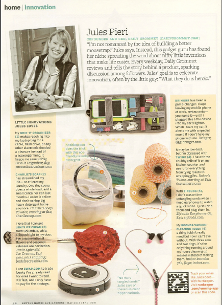 I am also thrilled for a bunch of great Grommets to get terrific coverage in Better Homes & Garden‘s May issue. This is the second biggest magazine in the US and Jody Garlock did a fine reporting job. It is also an treat to be featured in this “innovators” article next to the founder of Pinterest, Ben Silbermann. (Alas this is not online, so you either have to squint to read it, or buy the issue. It’s full of good content, so worth the price.)