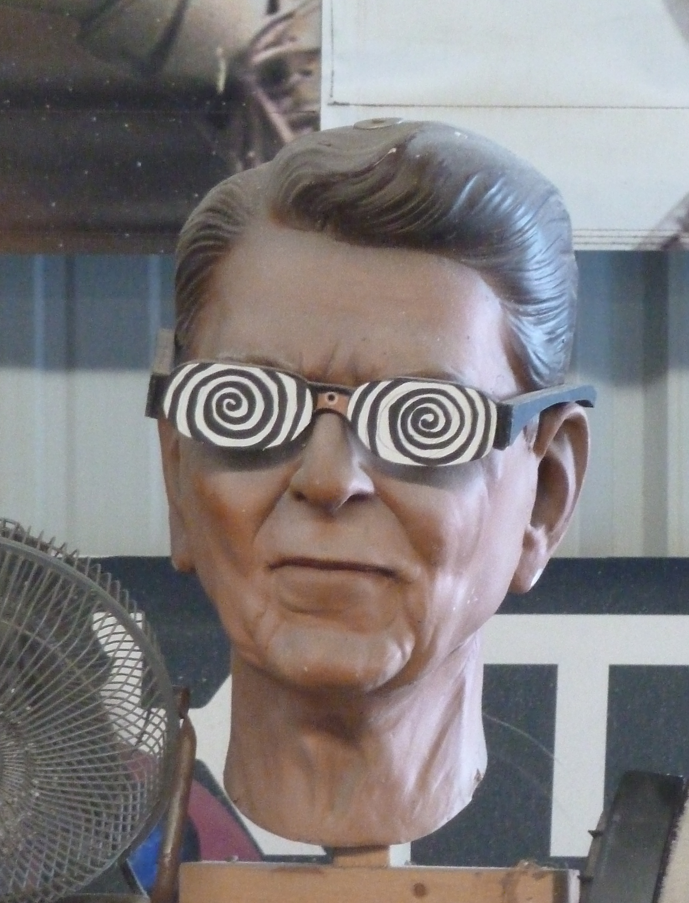 I didn’t ask about the excellent Ronald Reagan prop. Some jokester craftsman made his own statement about the ex-President by adding those hypnotic “charmer” glasses.