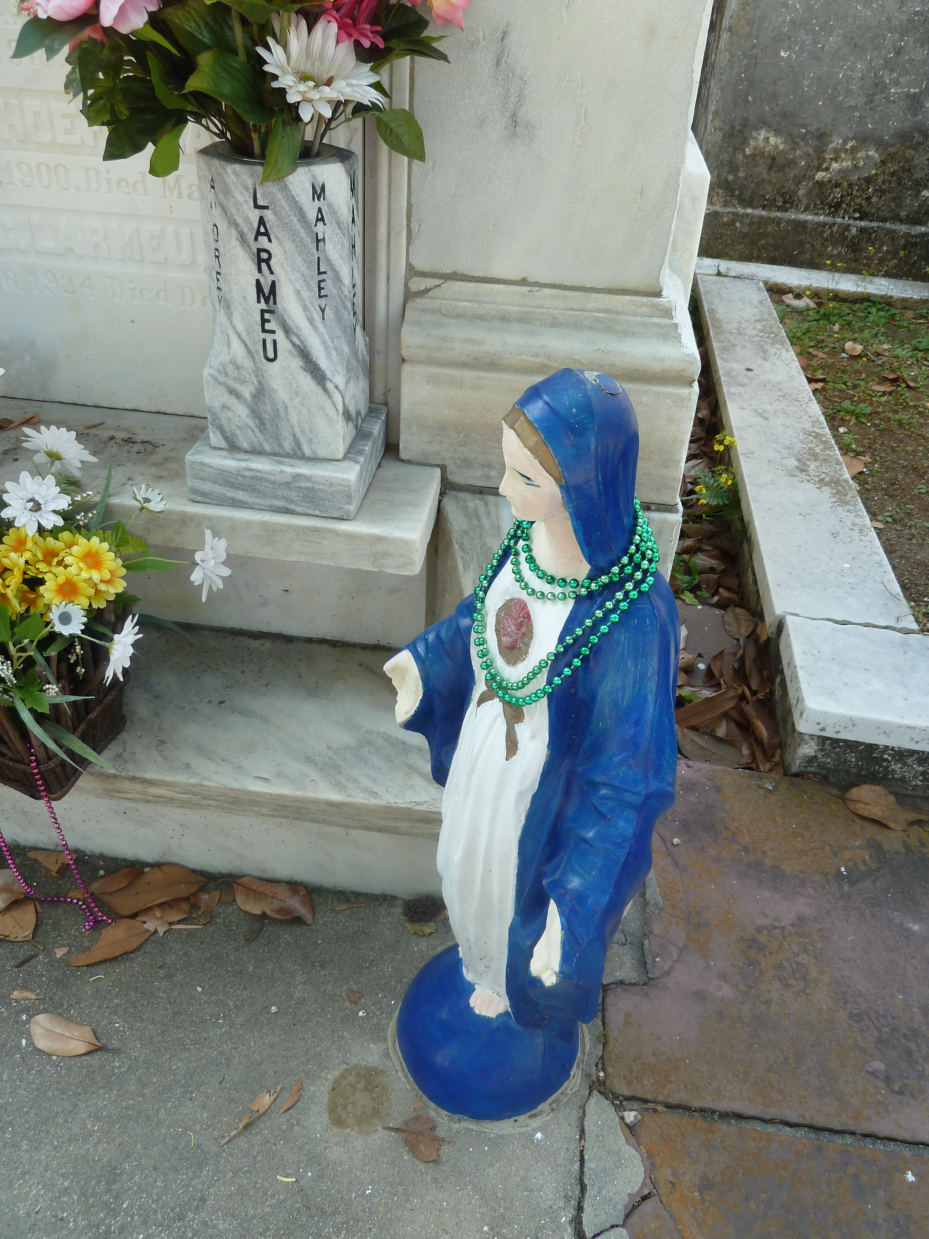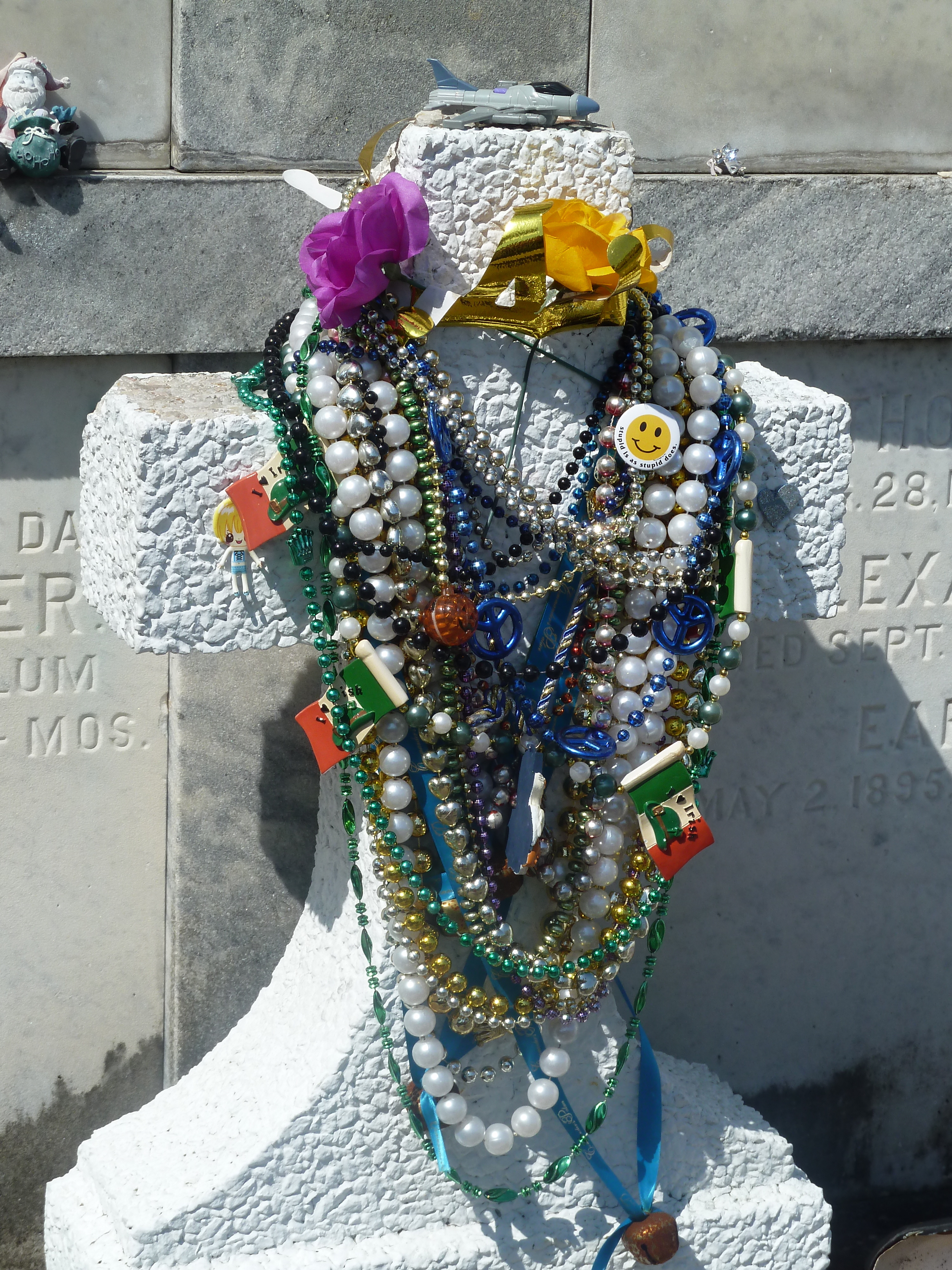 People seem to leave a trace of themselves all over New Orleans. Touring the Lafayette Cemetery, we learned how VooDoo rituals combine with Catholic burial traditions. In this case, on the tomb for “The Society for Destitute Orphan Boys” people leave Mardi Gras beads, toys, food, and coins to keep the boys entertained in the afterlife.