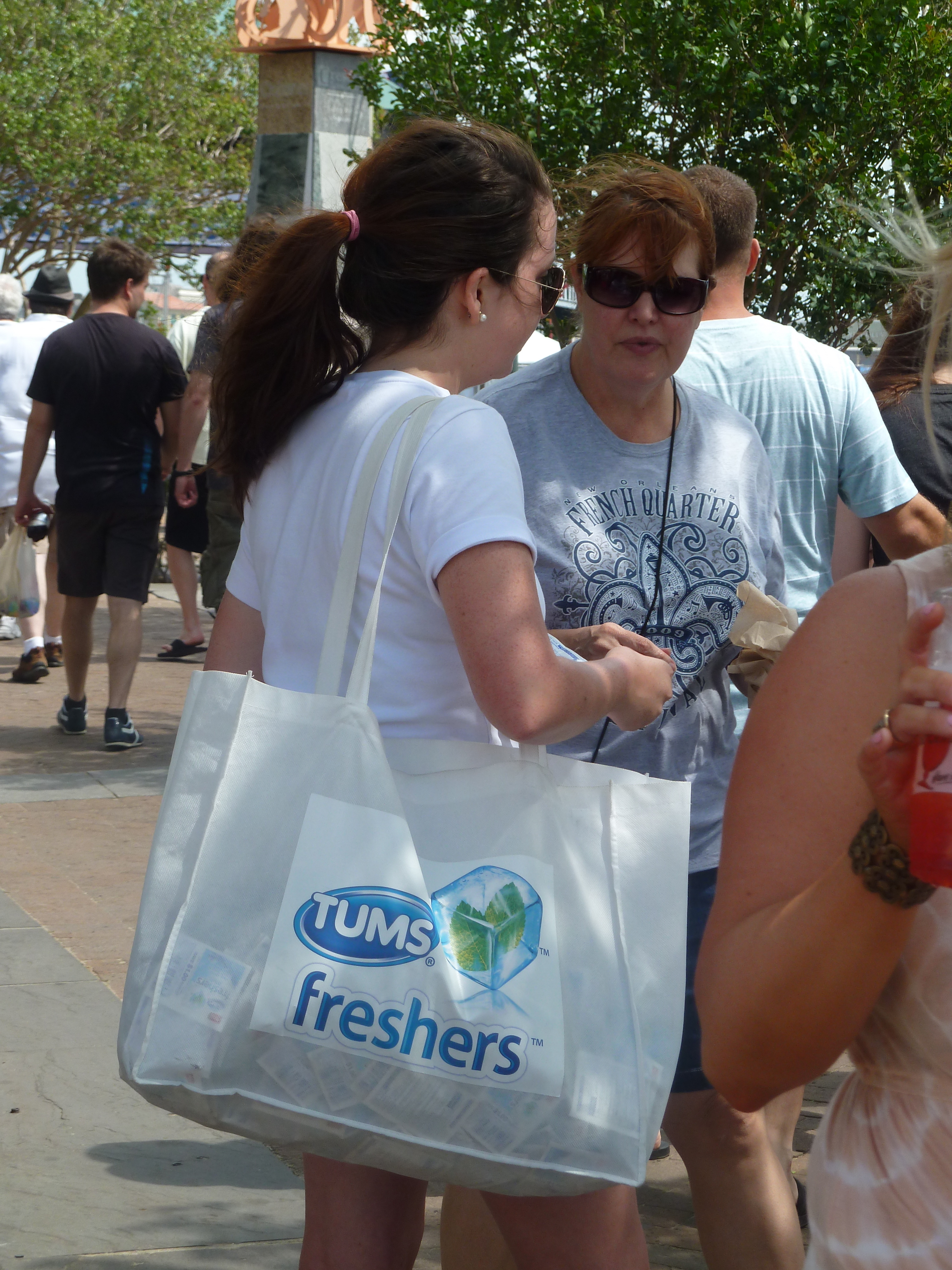 Locals favor this weekend’s French Quarter Festival.. It has 22 stages of free live music and endless food from local restaurants. In a brilliant stroke of marketing genius, Tums had women handing out a new form of antacid every 50 feet or so. See the next few photos to understand perfect fit for introducing this product at the Fest.