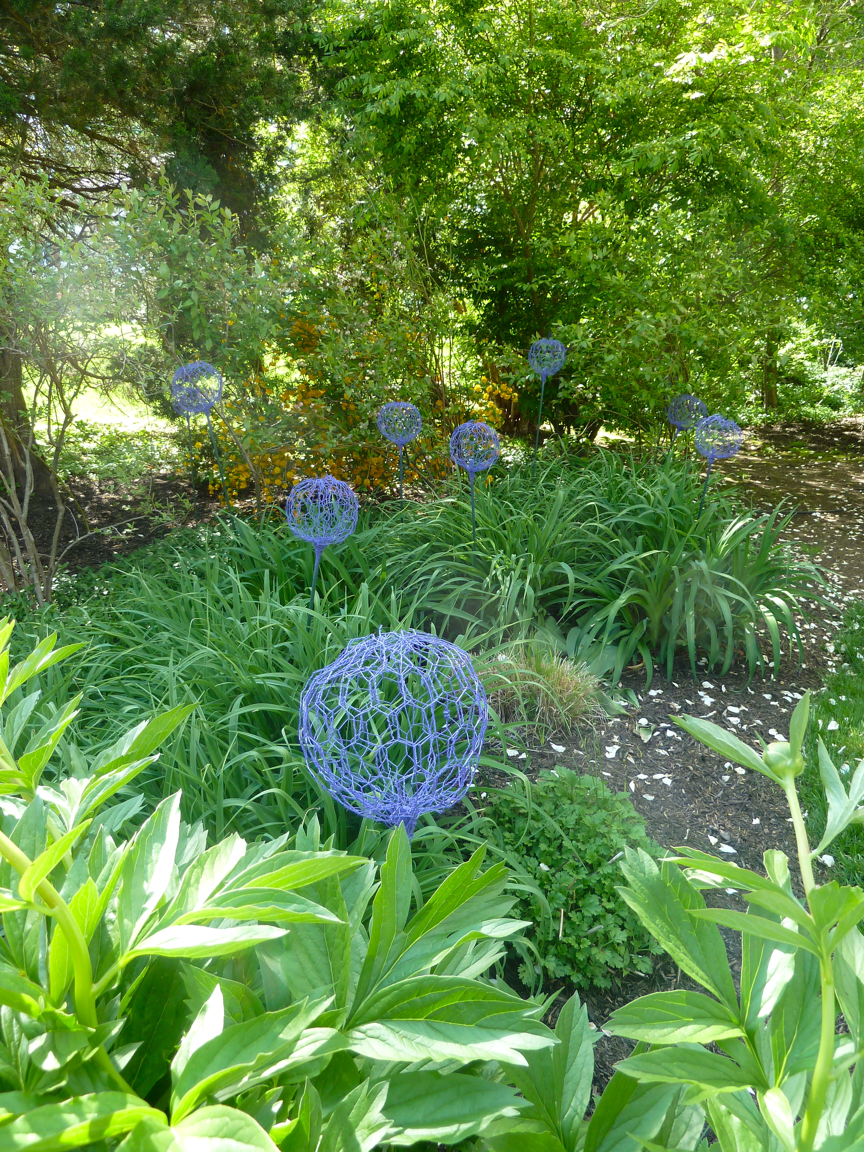 I used two layers of fine gauge chicken wire. I first cut them into rectangles and made a cylinder. As I was forming the cylinder I was crimping the edges to form a sphere. I layered one on top of the other and tied it “shut” with wire. Then I painted them with spray paint, after I wired them onto heavy plastic coated stakes. It was actually pretty easy, except for cutting the chicken wire.