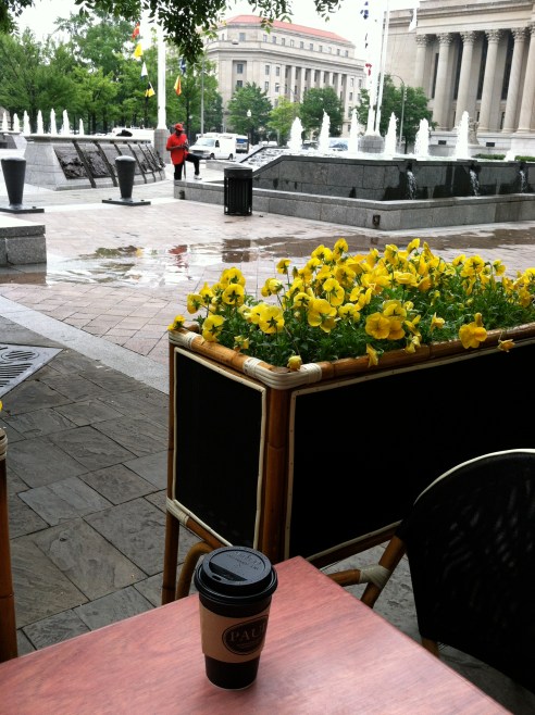 The “Paul” cafe has delicious coffee.  You can sip it while sitting outside.  You can sit  in comfortable French-y chairs, next to these  fountains and be right across from the National Archives.  And if you didn’t eat it too fast to perhaps take a photo, you could savor your memory of a delicious French Apple Turnover.