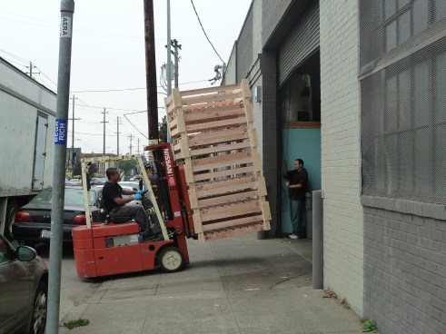 Before our arrival, we negotiated our car around a live police sting operation (seriously) to get to the Back to the Roots office and manufacturing facility. Killian was not impressed with the Oakland Police Department activities, but this little red front loader going into Back to the Roots really got him going.