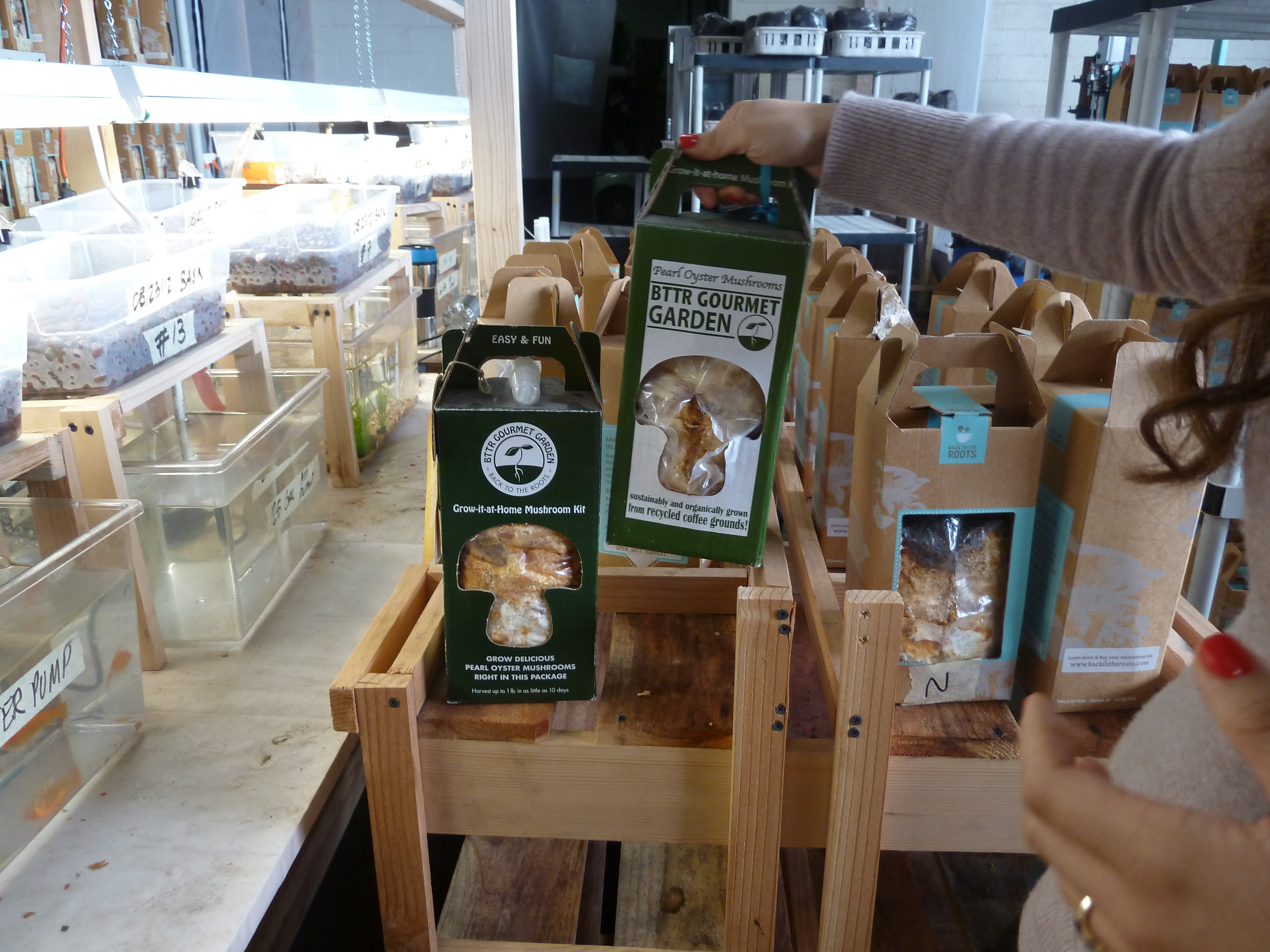 Our host for the tour, Mai-Ling Garcia, is in charge of their direct to consumer (as opposed to wholesale) operations. She is standing in front of a bunch of BTTR mushroom growing experiments in this photo. I guess you could call this area their R & D lab.