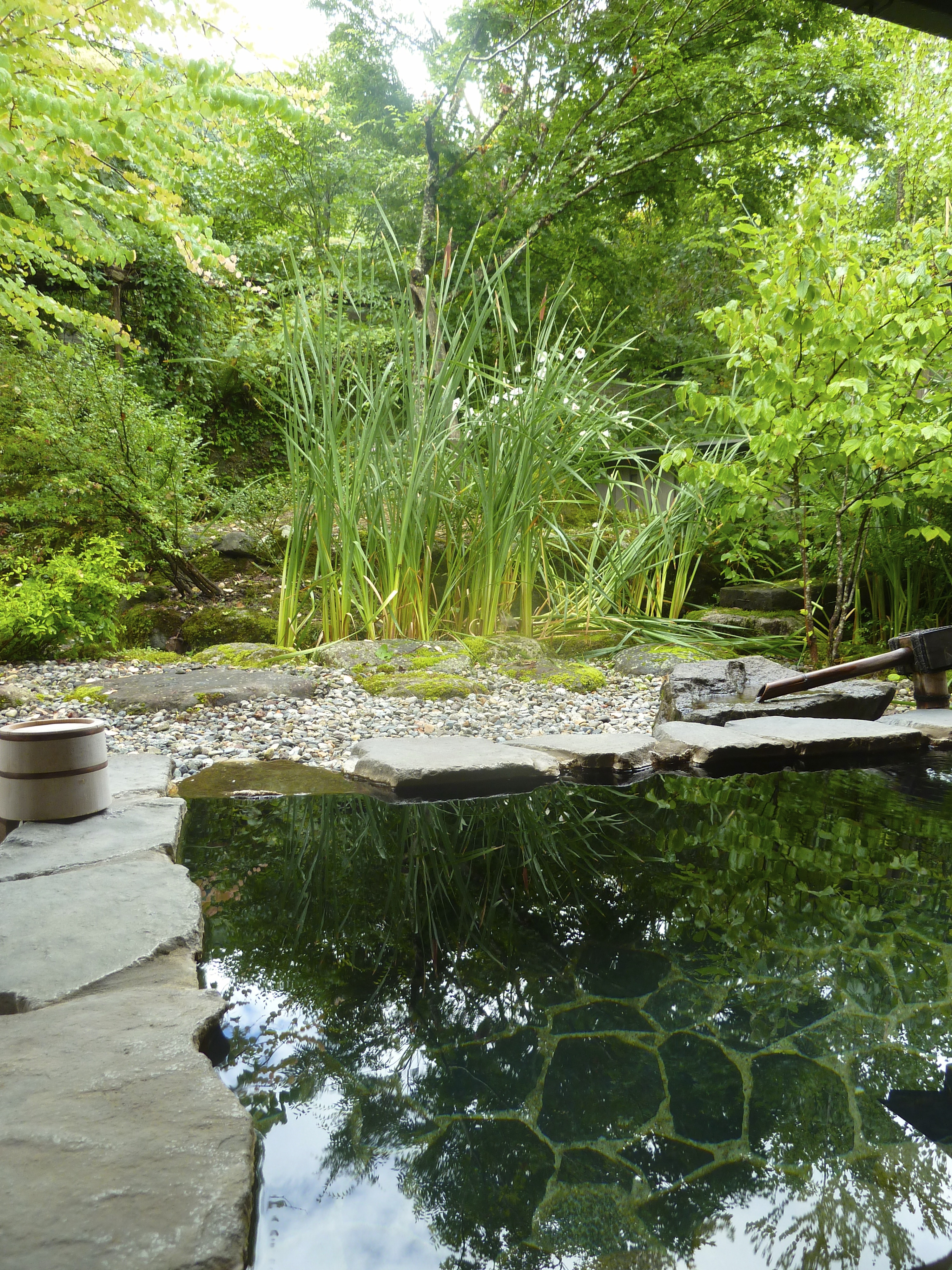 Beyond the sheer relaxation, sleeping on tatami mats, and the special food, a key reason to stay at a ryokan is their hot springs baths, called onsen. This is a view of a private one.