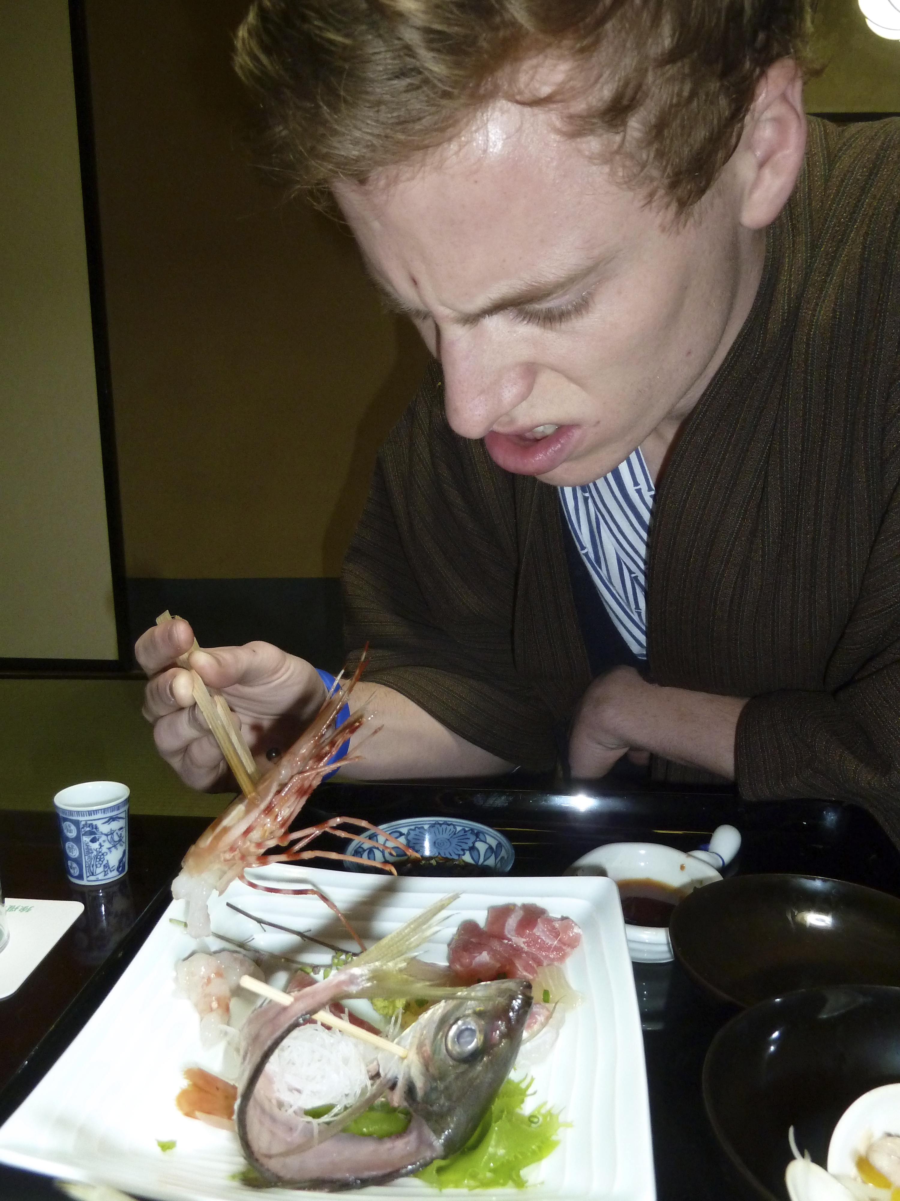 Gray had a love-hate relationship with our “mother” who was amazingly graceful in serving the many course meals, constantly narrating in Japanese. The food is unfamiliar and overwhelming at times. And she seemed to care DEEPLY whether Gray ate. At one point when she was out of the room to get another course, he said “I want to throw this down the toilet to make her happy”–it was some colorful cold dish of pickled something–“but she will think I liked it and bring more. I can’t win.”