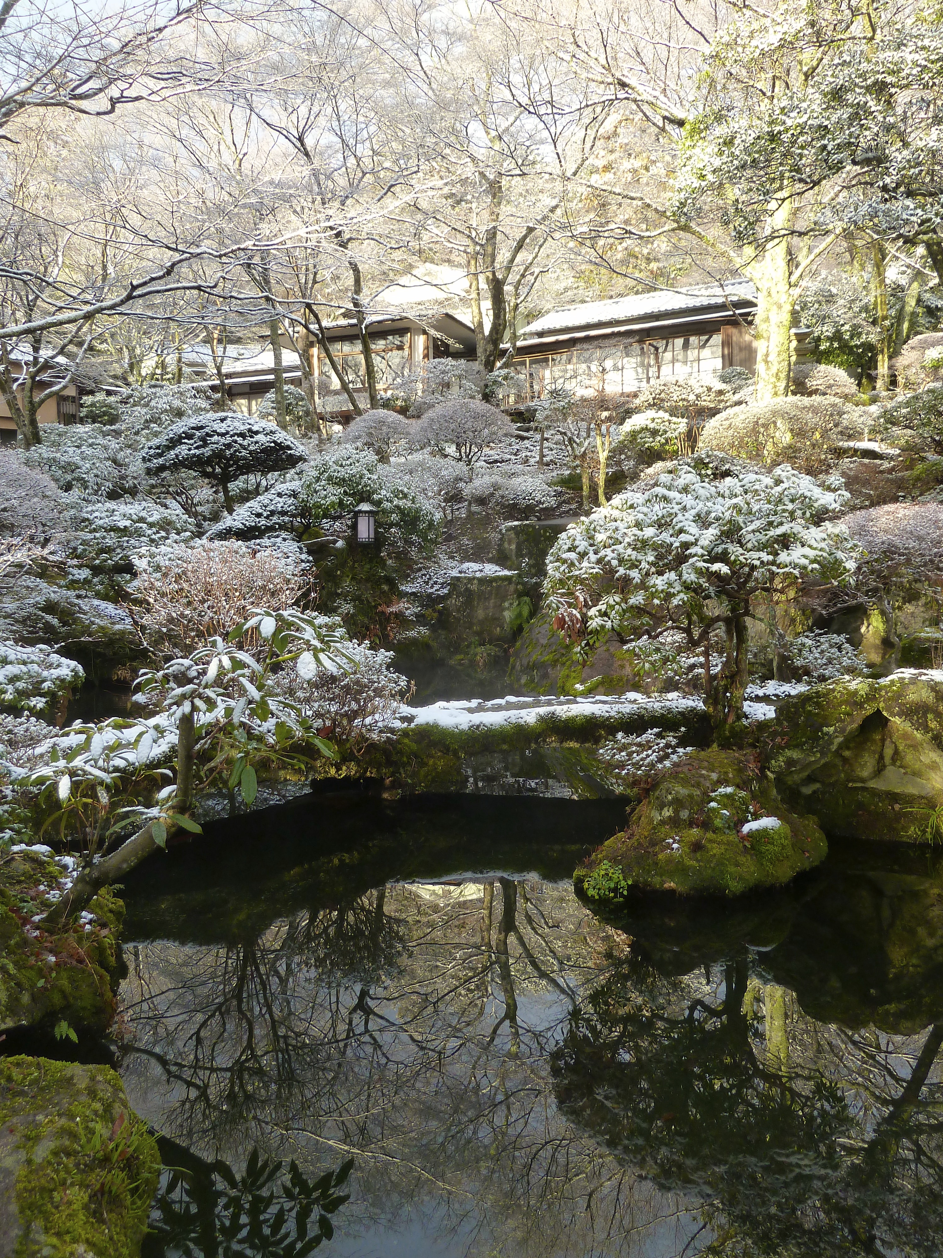I woke to this light snow sparkling on Gora-kansuiro ryokan garden where I could wander peacefully alone feeling like I was in a fairy land. I am starting to understand the special appeal of Japanese gardens that look so out of place to me in the US. The “real” ones are set so carefully into the landscape and have so many intimate vignettes. It’s like many little gardens in one.