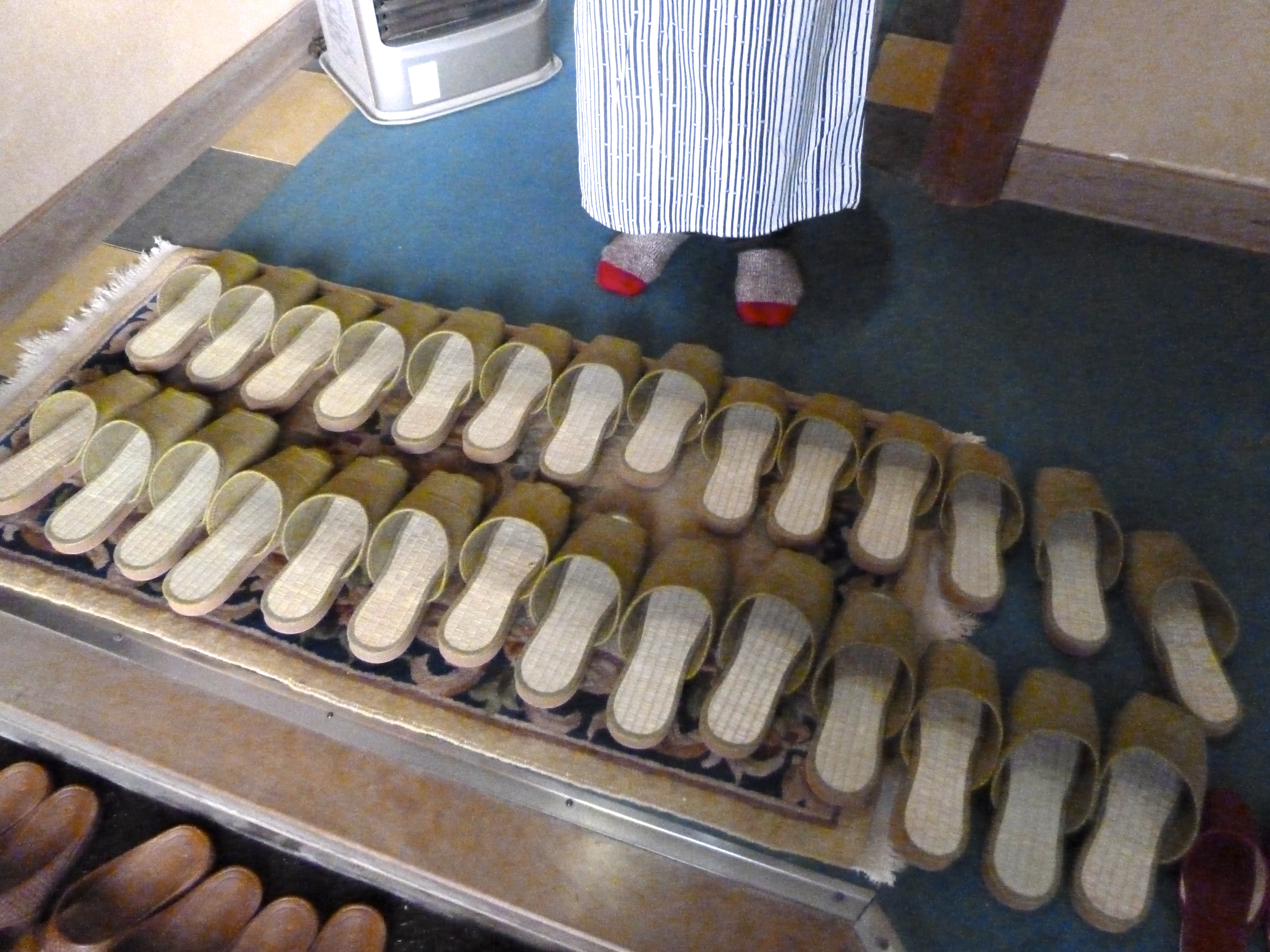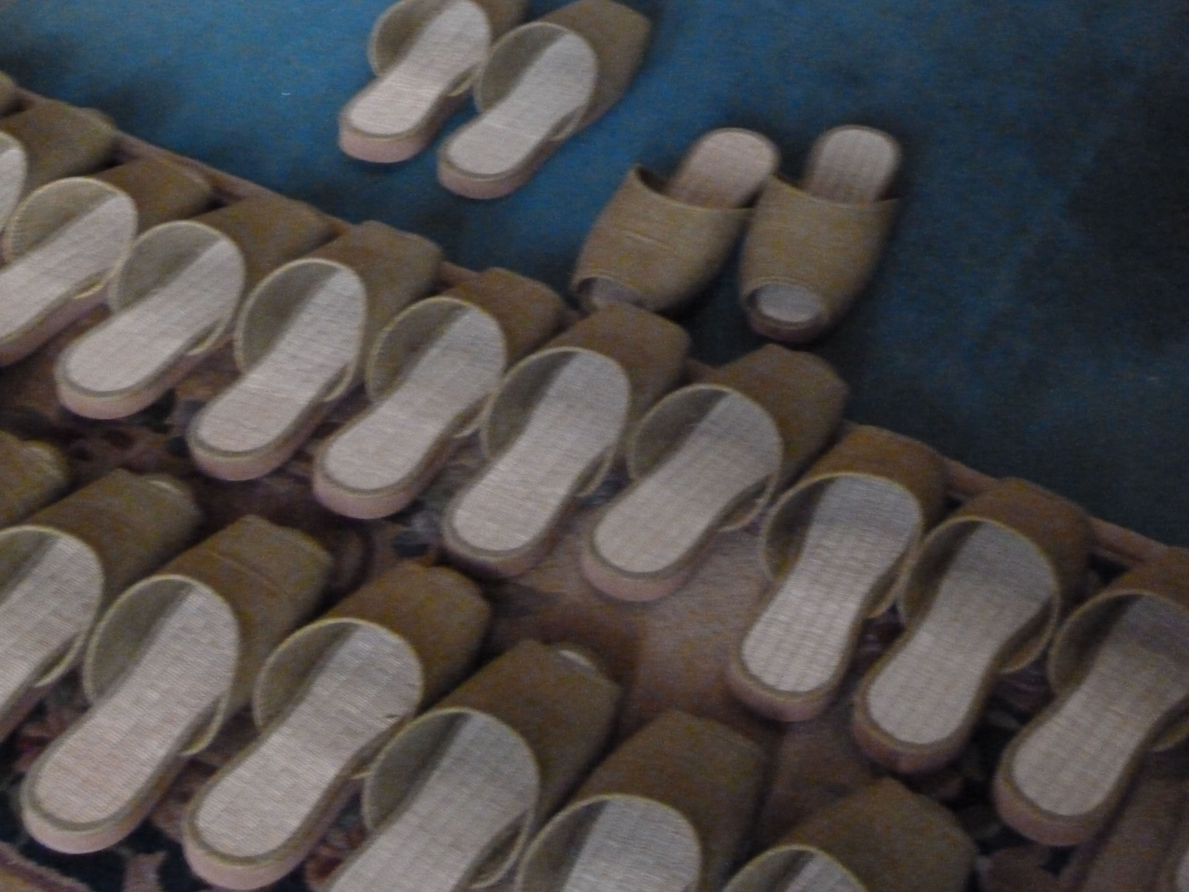 You find rows of communally shared slippers for your use as you travel in the hall ways. They are to be removed whenever you encounter a tatami mat. There is an art to lining them up backwards to how you are facing, as you remove them–so they can be slipped on when you come back from the opposite direction leaving the tatami mat area. As you can see, we had not mastered the art. It is easy to see which slippers the Americans deposited.
