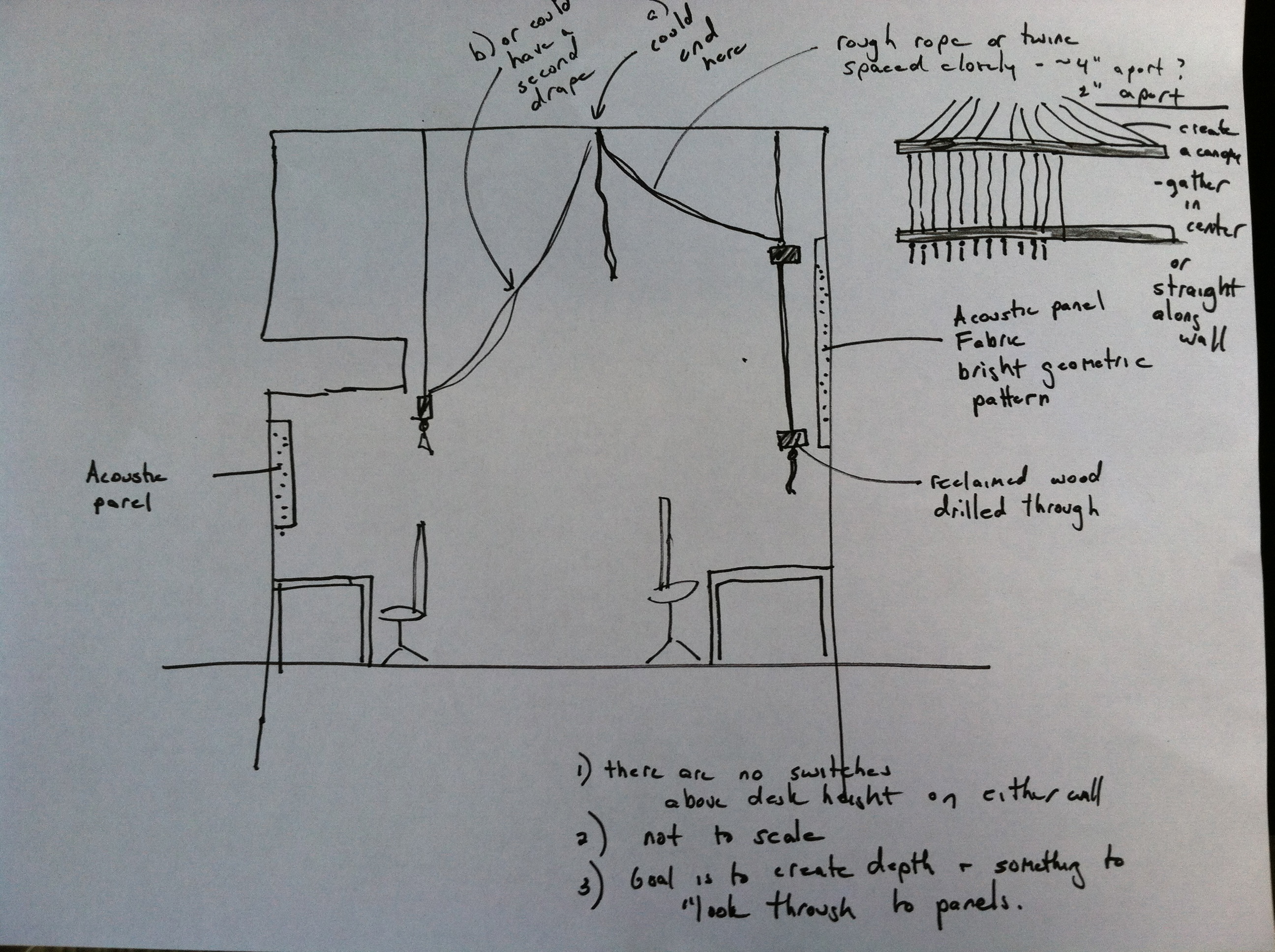 I rely on the magazine for restaurant recommendations too, but I actually clipped this one, below, for the Peruvian yarn sculpture on the ceiling in this restaurant. It will help me to illustrate a sculpture idea I have in mind for our Community Experience Team office, which needs some sex appeal. I had drawn my idea up roughly, below, but this photo will close the gap in understanding.