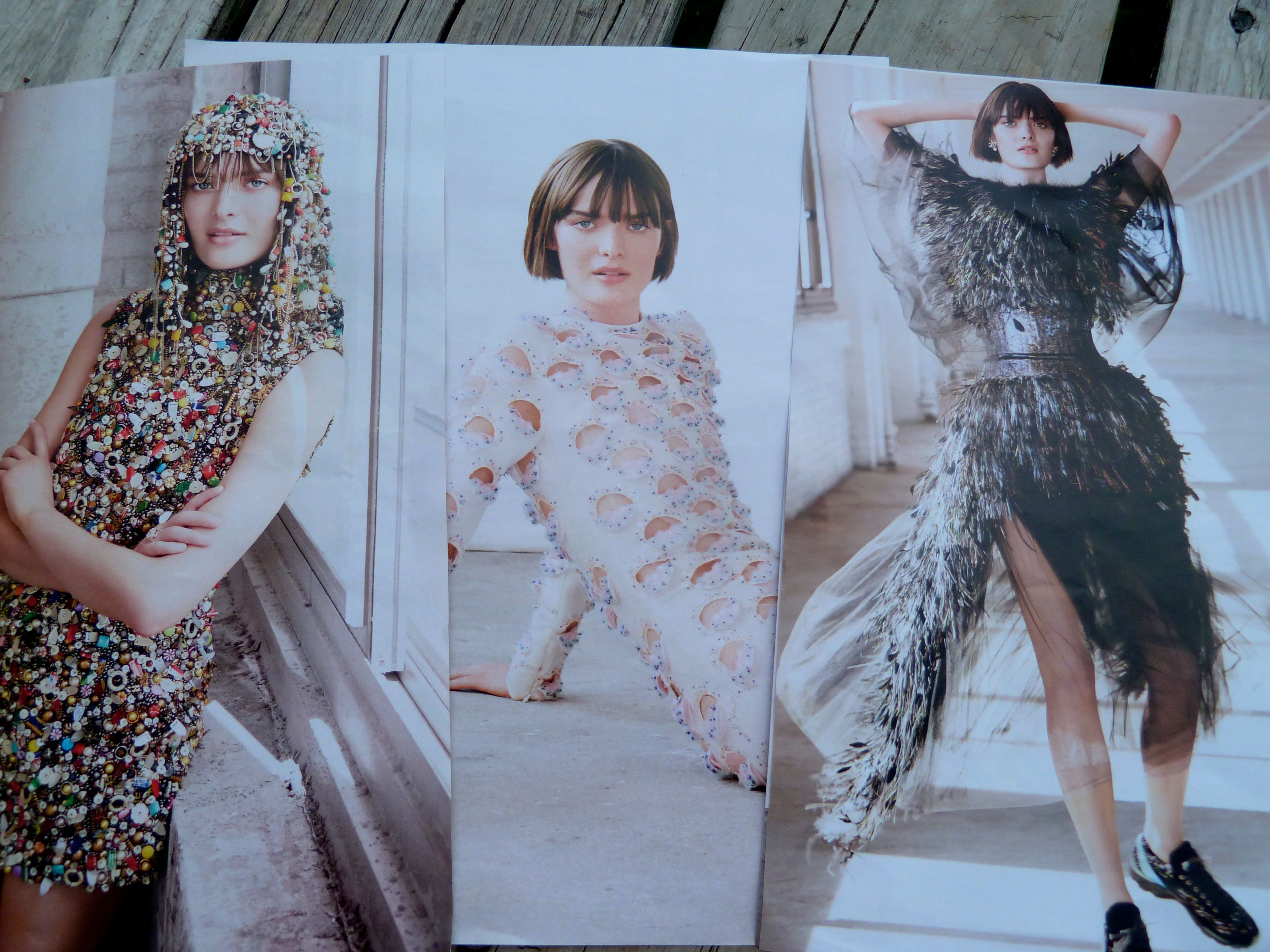 Even though I have no personal ambition to own designer clothes, there was something really compelling about these expertly embellished pieces, below, in the Wall Street Journal magazine, so I had to clip them. The article was actually called “Can you Kick it?” and focussed on the trend of pairing sneakers with “confectionary” haute couture. I will tuck that idea in the back of my mind as I have seen that executed on the runway several times now.