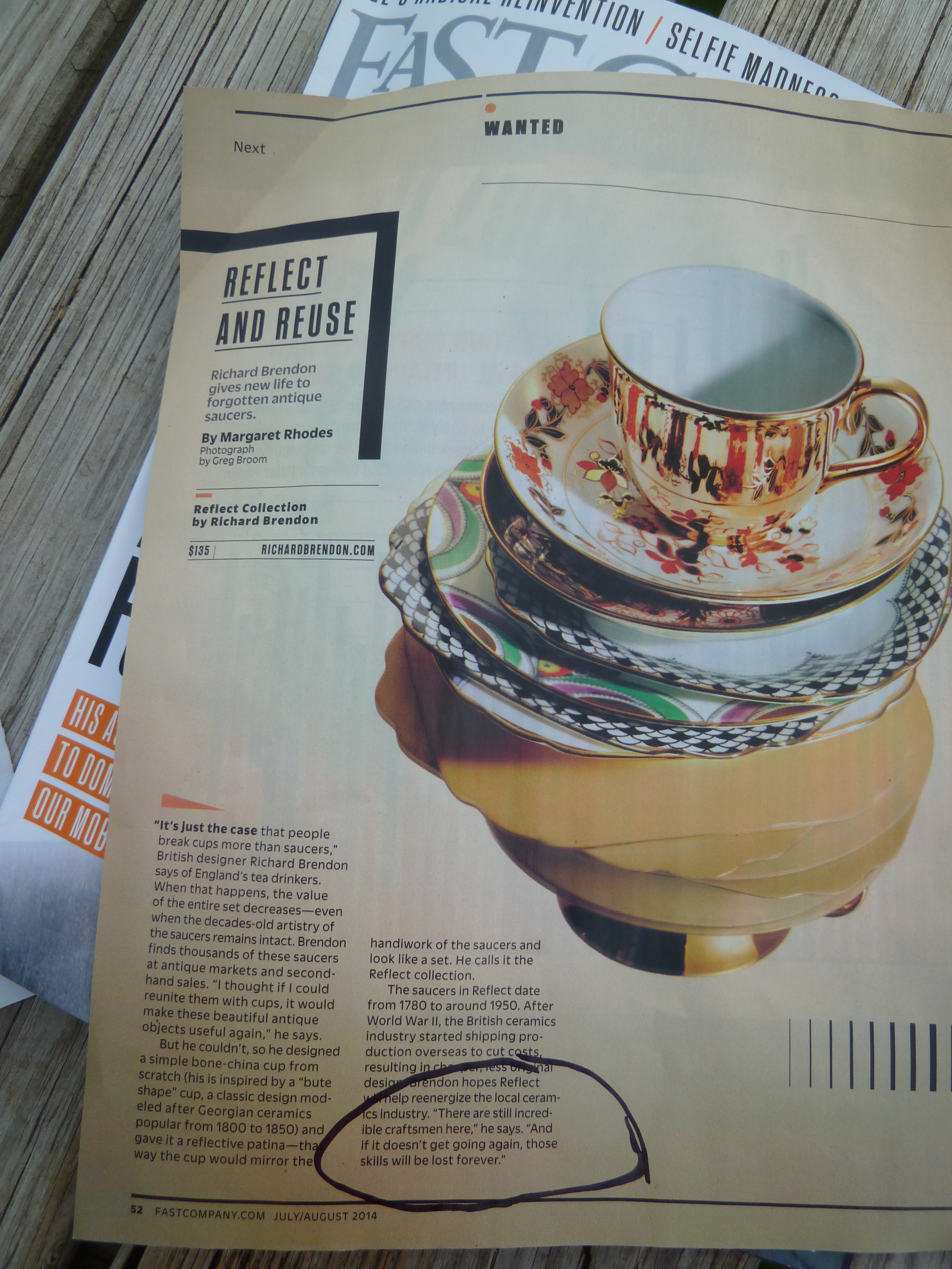 On the mostly-visual side of inspiration, I loved this idea below, from Fast Company. The insight is that Richard Brendon observed how, in the UK vintage markets, there are many more teacup saucers kicking around than there are teacups. He set out to try and marry the sets but the inventory was, well, imbalanced. So he invented this simple reflective bone-china cup so that it could pair with, and match via reflection, any saucer. Here’s the deeper value behind the product: After World War II, the British ceramics industry starting shipping production overseas to cut costs, resulting in cheaper, less original designs. Brendon hopes “Reflect” will help reenergize the local ceramics industry. He says, “There are still incredible craftsmen here. And if it doesn’t get going again, those skills will be lost forever.”