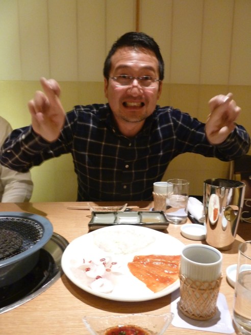 Yaz, President of Rakuten USA, crossing his fingers before we eat poisonous blowfish in Tokyo