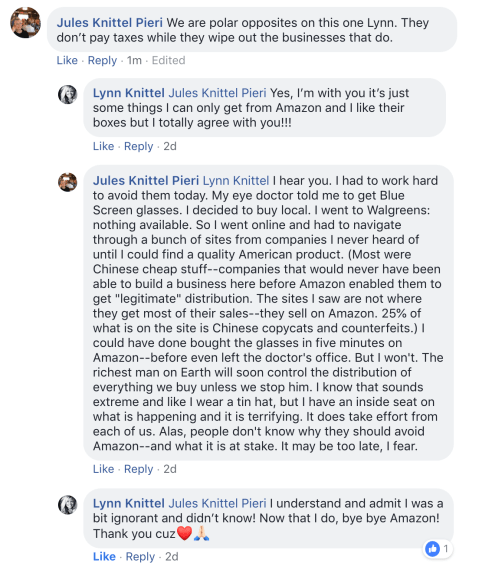 Sometimes Amazon is simply unavoidable–they have aggressively wiped out all the competition for a given product. But we can stop that steamroller by keeping our annual number of Amazon purchases in the single digits–strictly limited to products where Amazon is the only game in town. Competition provides stronger companies and living wages for today’s and future generations. Monopolies do not. You can be sure that protecting the economic fabric of society is not on the Amazon roadmap. But it is one of the most critical gifts we can give to our children.