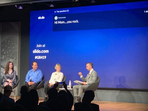Callum Borchers, the innovation reporter from WBUR, interviews me and Frank McGillin of Quell (out of frame), Marlie Kass of Smart Girls Jewelry, and George Peters of Kettle Pizza.