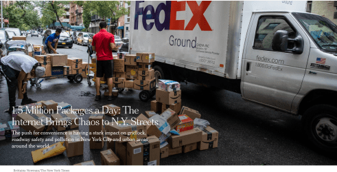 The New York Times has a front page story about the environmental impact of e-commerce on New York. The piece chronicles everything from traffic violations (515,000 traffic summonses of FedEx, FreshDirect, Peapod, and UPS alone), to developers creating soulless warehouses in poor neighborhoods, to apartment buildings using public sidewalks as Amazon sorting stations (compromising fully 50% of all shipments.)