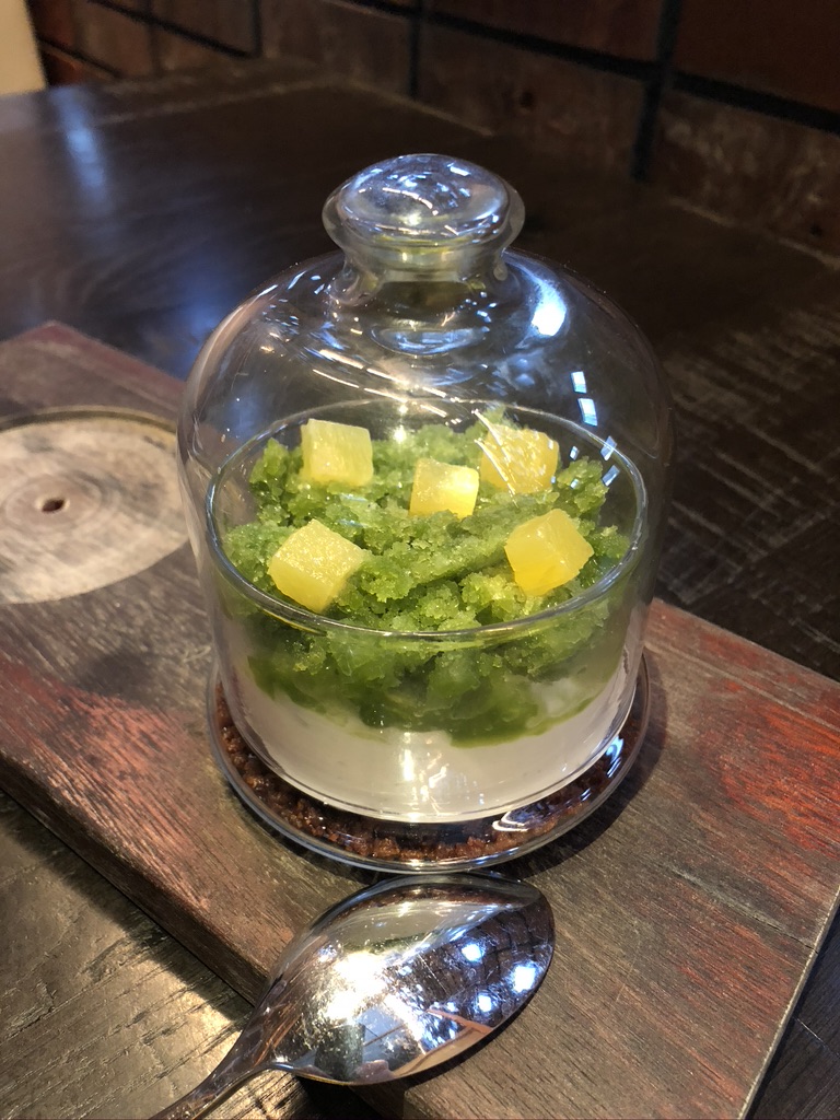 Dessert at Uchi: jasmine tea cream with honey crumble, cilantro granita and pineapple.
