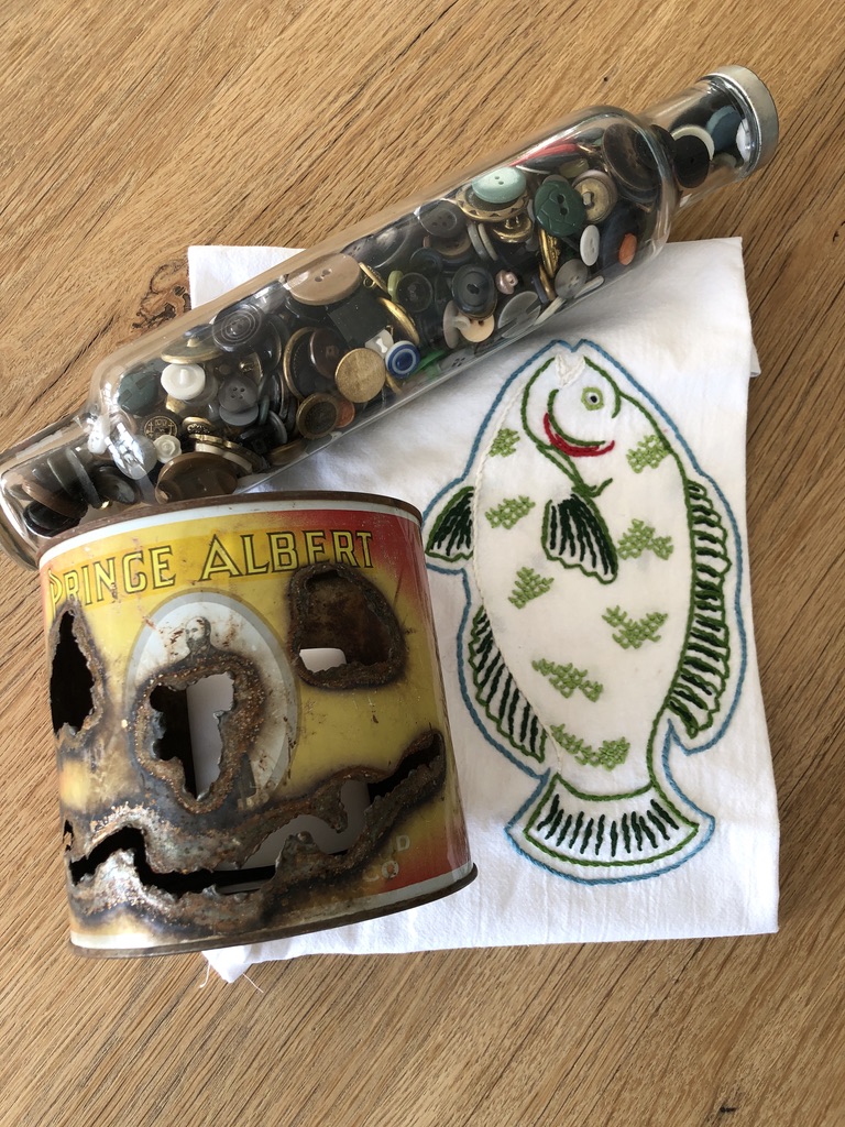 Vintage glass rolling pin filled with buttons, locally made flour sack towel, old tobacco can repurposed for scary Halloween candle holder