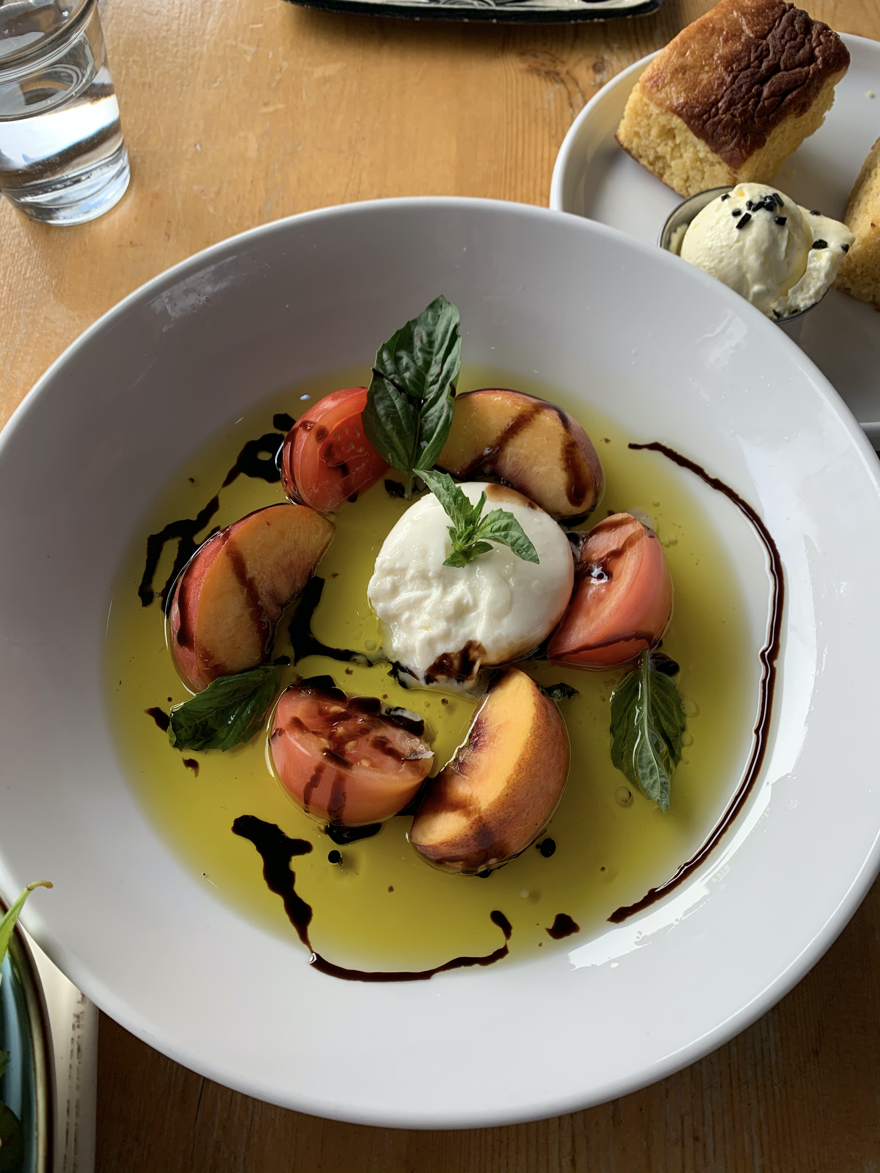 Peach and tomato caprese salad with fabulous cornbread in background.