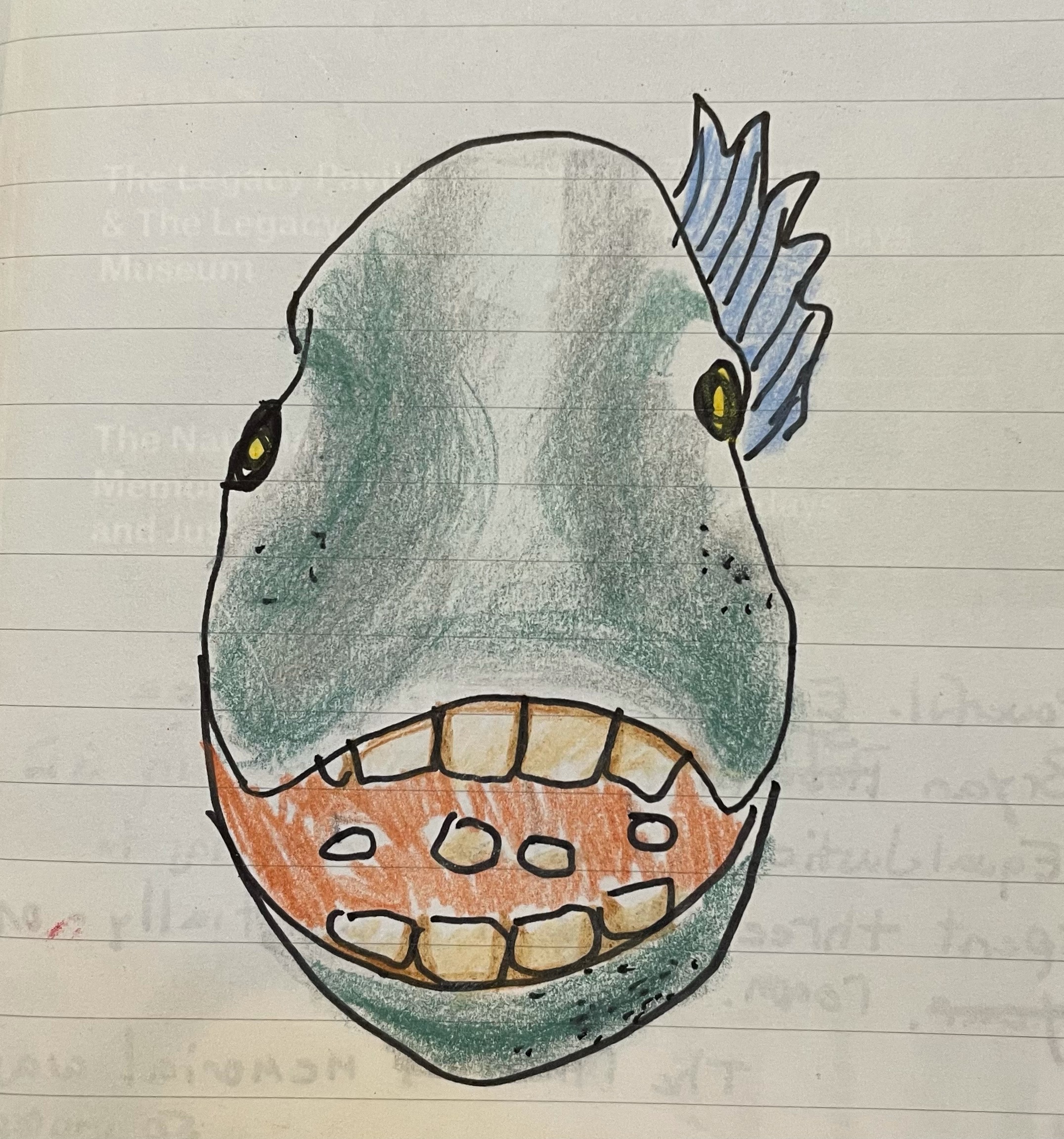 My drawing of Sheepshead Fish, ala a Google search. This is NOT what I saw on my plate. But those creepy rows of humanoid teeth enable it to live on a diet of delectable shellfish, which makes the Sheepshead a very tasty creature indeed.